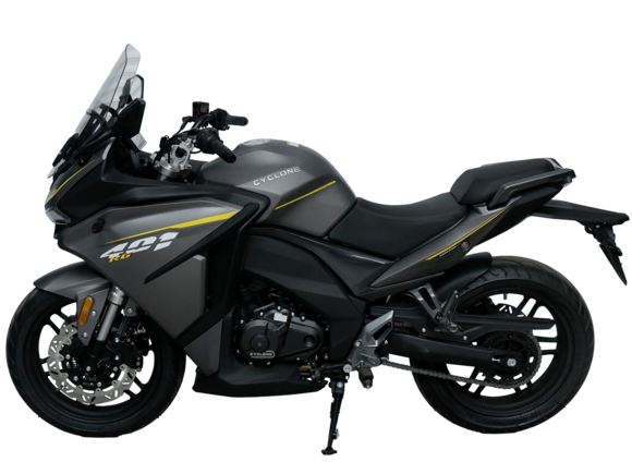 Мотоцикл CYCLONE RA600 – двухместный круизёр, готовый рассекать по городу и скоростным трассам. Лёгкая в управлении и надёжная модель с 550-кубовым двигателем, имеющая комфортный расход топлива для ежедневных поездок, хороший запас хода и оптимальную длину передач для маневрирования в потоке.Мотоцикл оснащён 2-цилиндровым 4-тактным двигателем ZS550SR жидкостного охлаждения с 4 клапанами на каждом цилиндре и 2 распредвалами. Двигатель имеет объём 550 см³ и способен обеспечить мощность в 59 л.с. при 8500 об/мин. Максимальный крутящий момент в 55 Нм достигается при 6500 об/мин. Подачу топлива обеспечивает инжектор BOSCH. Механическая коробка передач имеет 6 ступеней и схему 1-N-2-3-4-5-6.Максимальная скорость 165 км/ч.Объём топливного бака 14,5 литра.Колёса с легосплавными дисками имеют диаметр 16 дюймов. В качестве подвески используются телескопическая вилка и регулируемый маятник с моноамортизатором. Мотоцикл оснащён датчиками давления в шинах, показатели от которых выводятся на приборную панель. Клиренс в 150 мм позволяет комфортно проходить препятствия на дороге.Тормозная система произведена компанией J.JUAN, входящей в холдинг BREMBO. На оба колеса установлены гидравлические дисковые тормоза. Спереди установлен 2-поршневой суппорт, сзади используется однопоршневой суппорт с плавающей скобой. Дополнительную безопасность обеспечивают системы ABS и TCS. Они повышают устойчивость при экстренном торможении и на сложных поверхностях.Габариты модели 2190х855х1115 мм, снаряженная масса 198 кг. Высота по седлу 725 мм, колёсная база 1510 мм. Мотоцикл оснащён USB-портом для зарядки устройств.
