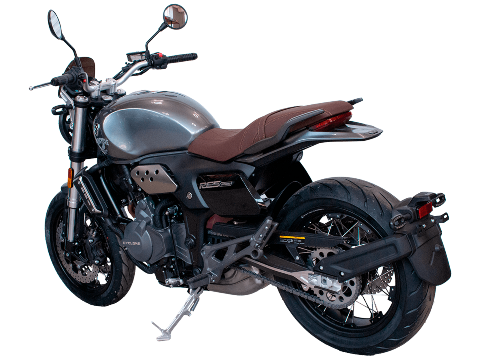 CYCLONE RE5 (SR600) – классик, в котором брутальная простота объединяется с современными технологиями. Данная модель является самой крупнокубатурной среди классических мотоциклов компании CYCLONE.Двухцилиндровый четырёхтактный двигатель объёмом 550 см3 выдаёт 60 л.с. на 8500 об/мин. Максимальный крутящий момент достигается на 6500 об/мин и составляет 55 Н·м. Инжекторный впрыск топлива с блоком управления BOSCH увеличивает топливную экономичность, а также позволяет добиться высокой приёмистости и неприхотливости агрегата. Жидкостная система охлаждения не допустит перегрева двигателя даже при самом агрессивном вождении. На мотоцикл установлена 6-ступенчатая механическая коробка передач.Максимальная скорость мотоцикла составляет 170 км/ч.RE5 оснащён классическими спицевыми колёсами диаметром 17 дюймов. Колёса обуты в бескамерные покрышки от легендарной фирмы PIRELLI. С неровностями дороги эффективно справляются телескопическая вилка перевёрнутого типа спереди и маятник с моноамортизатором сзади. Ход передней подвески составляет 120 мм, задней – 50 мм. Оба компонента подвески являются регулируемыми. Эффективное и безопасное замедление с любых скоростей обеспечивают гидравлические дисковые тормоза с ABS спереди и сзади. Тормозные системы произведены известной испанской фирмой J.JUAN (входящей в легендарный холдинг BREMBO).Клиренс мотоцикла составляет 155 мм. Объём топливного бака – 20 л. Снаряжённая масса – 204 кг.Из дополнительного оборудования можно выделить USB-порт и датчики давления в шинах.Мотоцикл сочетает в себе отличные технические характеристики, комфорт и надёжность, что позволяет вам ощутить настоящую свободу на любой дороге.