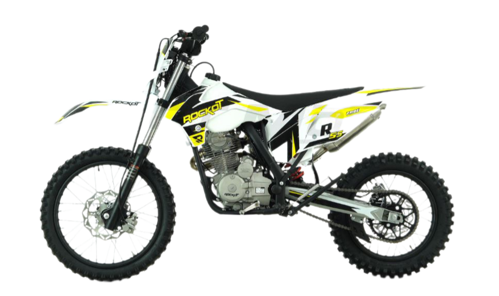 1ROCKOT R5S - эндуро мотоцикл начального уровня, который создан для новичков и подростков. Небольшая высота по седлу и короткая колесная база обеспечивают отличную управляемость и позволяют управлять мотоциклом людям, чей рост достигает 150 см. ROCKOT R5S построен на базе уже известных многим мотоциклов ROCKOT R5 Cyclone и R5F Raptor. ДизайнМотоциклы ROCKOT серии R имеют общую раму, пластик и концепцию дизайна. Различна между ними цветовая схема графики облицовочного пластика.Рама мотоцикла R5S окрашена в черный цвет. На белом облицовочном пластике нанесена прочная защитная пленка с графикой в белом черном и желтом цветах. Сам пластик выполнен в стиле КТМ 2015. Передние амортизаторы и обода колесных дисков, как и рама, окрашены в черный матовый цвет. ДвигательЭндуро мотоцикл ROCKOT R5S оснащен четырехтактным двигателем, объемом 144,6 см³ и мощностью 11,6 лошадиных сил. Система ГРМ 2-х клапанная с верхним распредвалом. Запуск двигателя может осуществляться как электростартером, так и кик-стартером. Коробка передач - пятиступенчатая с многодисковым сцеплением в масляной ванне. Двигатель очень отзывчиво откликается на ручку газа, но в то же время прощает ошибки, поэтому данная модель и будет идеальной для новичка. РамаROCKOT R5S построен на раме типа К5, ставшей очень известной благодаря мотоциклам ROCKOT R5 Cyclone и R5F Raptor. При том, что это мотоцикл с высотой по седлу равной питбайку, он имеет настоящую полноценную мотоциклетную раму из хром-молибденовой стали. Геометрия рамы идеально сбалансирована для эндуро и обеспечивает отличную управляемость на бездорожье. Подрамник также выполнен из стали. ПодвескаДанная модель построена на классической эндуро подвеске. Спереди установлена телескопическая вилка с толщиной перьев 37 мм, что является внушительным диаметром для классической вилки. Сзади установлен стальной маятник с моноамортизатором. Конструкция задней подвески - безлинковая, что упрощает обслуживание мотоцикла. Тормозная системаПолностью вся тормозная система мотоцикла - дисковая гидравлическая. Спереди и сзади установлены тормозные диски равного диаметра - 240 мм. Сзади установлен однопоршневой тормозной суппорт, спереди - двухпоршневой. КолесаВажная отличительная часть мотоцикла - колеса размерностью 19/16. Данное решение позволило сделать среднеразмерный эндуро мотоцикл идентичным по геометрии и управляемости полноразмерному эндуро, а также уменьшить высоту по седлу. Спереди установлена шина размерностью 80/100-19, сзади - 110/90-16 с внедорожным грязевым протектором.. Также, в отличие от других мотоциклов подобной компоновки, он приводится в движение цепью с 520 шагом, тогда как у других мотоциклов установлена цепь с шагом 428. Стальная приводная ведомая звезда на 47 зубьев обеспечивает высокий крутящий момент и позволяет заезжать на высокие подъемы с крутым уклоном. Кому подойдет эндуро мотоцикл ROCKOT R5SROCKOT R5S можно назвать промежуточной моделью между питбайком и полноценным мотоциклом. Колесная база мотоцикла - 1340 мм, а высота по седлу - 850 мм. Если вы задумываетесь, что вам подойдет больше, питбайк или мотоцикл - ROCKOT R5S для вас. Данная модель поможет райдеру понять принцип управления мотоциклом, научиться пользоваться мотоциклетной пятиступенчатой коробкой передач и почувствовать отличную управляемость, которая присуща только мотоциклам. Данную модель высоко оценя