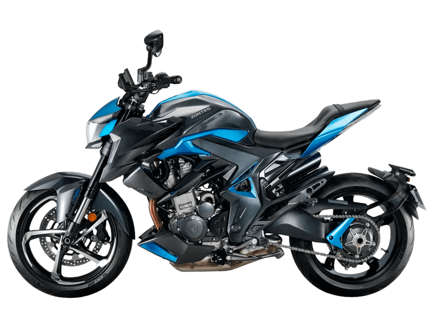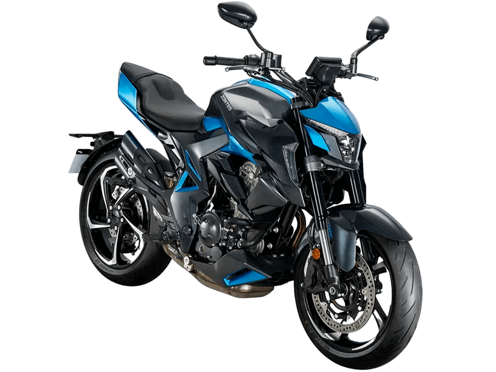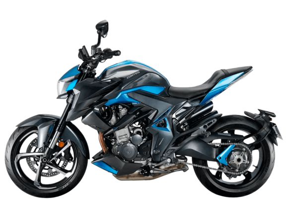 Мотоцикл ZONTES ZT350-R1 – современный нейкед со стремительным и дерзким дизайном. Хорошо подходит как для поездок в городской среде и маневрирования в межрядье.Силовая установка представлена одноцилиндровым 4-тактным двигателем ZT184MP с 4 клапанами и 2 верхними распредвалами. Двигатель имеет объём 348 см³ и обеспечивает мощность в 39 л.с. Оснащён инжектором BOSCH и системой жидкостного охлаждения. Механическая коробка передач имеет 6 ступеней и схему 1-N-2-3-4-5-6. Запуск двигателя осуществляется с помощью бесключевого доступа.Ёмкость топливного бака 15 литров.Колёса представлены литыми алюминиевыми дисками диаметром 17 дюймов. На мотоцикл установлены датчики давления в шинах, показатели от которых выводятся на приборную панель. Для подвески спереди используется телескопическая вилка, сзади – моноамортизатор. Гидравлические дисковые тормоза произведены испанской компанией J.JUAN, входящей в холдинг BREMBO.Для освещения используется яркая LED-оптика, а приборная панель представлена цифровым дисплеем. Рычаги тормоза, сцепления и лапки КПП можно отрегулировать. Имеется 2 USB-порта.Габариты мотоцикла 2030х795х1120 мм. Колёсная база 1390 мм. Высота по седлу 795 мм. Вес 165 кг.