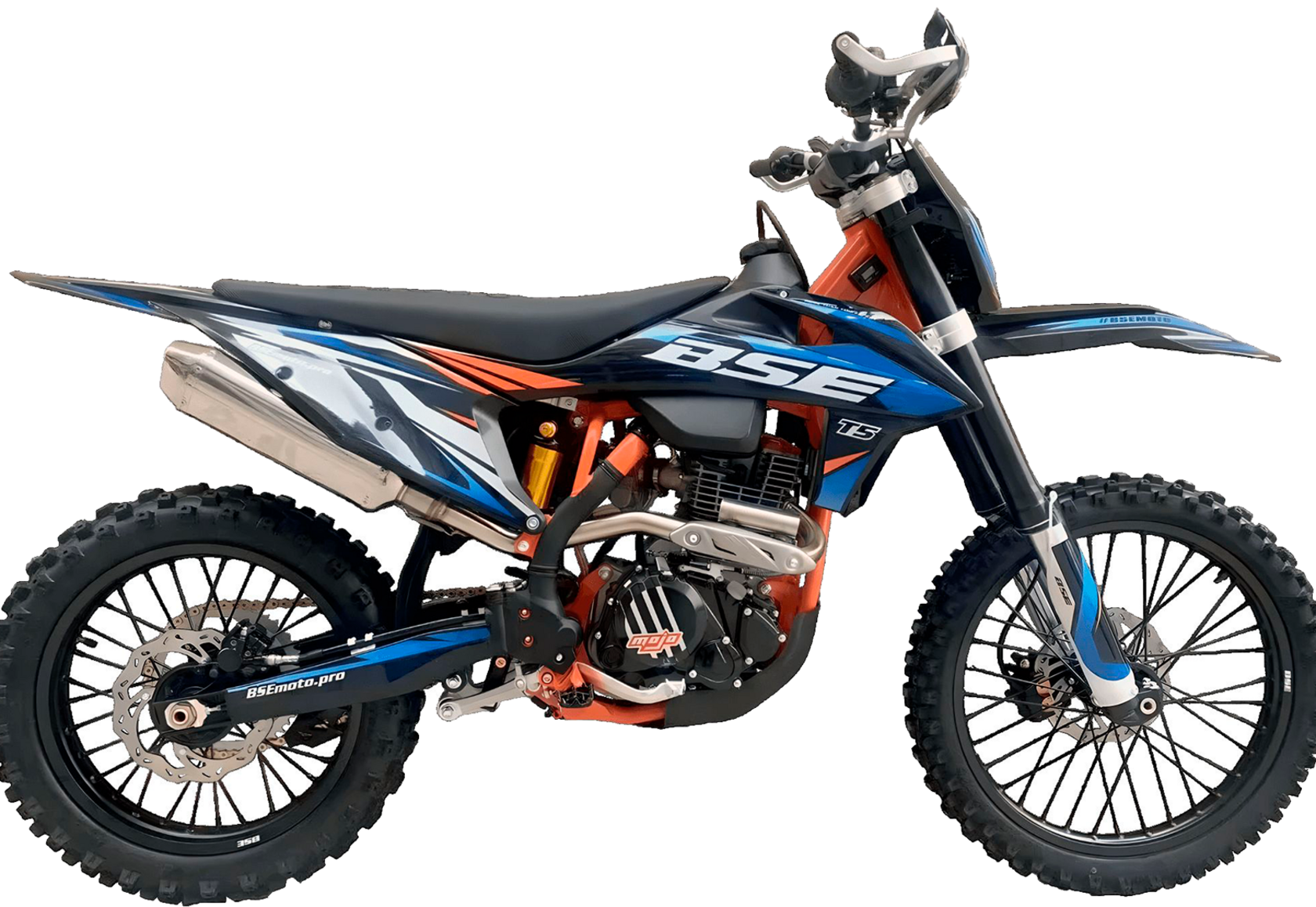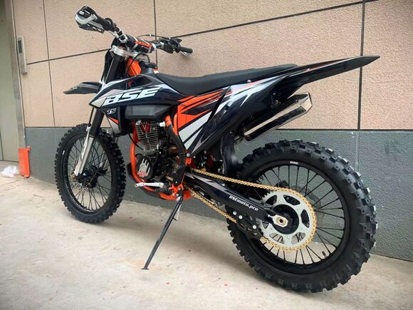 Новинка 2023 года от BSE - модель Т5 из абсолютно новой Т-серии!Наша гордость – мотор TYAN TYX300, который уже отлично зарекомендовал себя на модели Z11. Данный мотор является эксклюзивным для бренда BSE на российском рынке. Официально только у BSE Russia есть разрешение на установку мотора TYAN TYX300 на свою продукцию.Ещё одна особенность модели Т5 - абсолютно новая рама, которая полностью соответствует всем стандартам самого известного австрийского бренда мотоциклов для кросса и эндуро – KTM. Единая геометрия, эргономика, пропорции и углы вылета вилки. Высококачественная сталь, малый вес и большой запас прочности, идеальная развесовка. Мотоцикл оснащен легким алюминиевым подрамником, системой прогрессии и пластиковой защита мотора. Установлен новый тип пластика - прочный, легкий и современный. Колесная база в 1460 мм добавляет отменную маневренность.T5 оборудован фирменной заводской спортивной подвеской BSE Mojo Racing. Подвеска с большими ходами имеет полный диапазон регулировок и помогает отрабатывать даже самые жесткие приземления, с лёгкостью "глотая" все неровности. Подвеску легко настроить под любой рельеф, любую трассу и стиль езды. Вы ощутите результат, когда будете сокращать секунды круг за кругом! Особое внимание было направлено на снижение веса всей подвески.Разработка подвески BSE Mojo Racing производилась опытными инженерами-подвесочниками завода, а настройка - под чутким контролем заводской спортивной китайской командой BOSUER. Спереди установлена полностью регулируемая вилка «перевертыш» BSE Mojo Racing c перьями диаметром 53/58.5 мм, 930 мм. Сзади установлен полностью настраиваемый моноамортизатор BSE Mojo Racing 480 мм.На T5 установлен топливный бак на 8 л, мощная тормозная гидравлическая система с дисками диаметром 240 мм, звезды 13t – 49t, «зубастые» покрышки Carrystone 80/100-21 спереди и 110/90-18 сзади. Мотоцикл оснащается полностью светодиодной фарой головного света, грипсами и ручкой газа Nibbi Racing, цепкой шкуркой сиденья.Легкий (сухая масса 120 кг), прекрасно сбалансированный, мощный мотор. Отточенная управляемость. Подходит для новичков, а также спортсменов в дисциплинах эндуро, хард-эндуро, супер-эндуро, мотокросс.