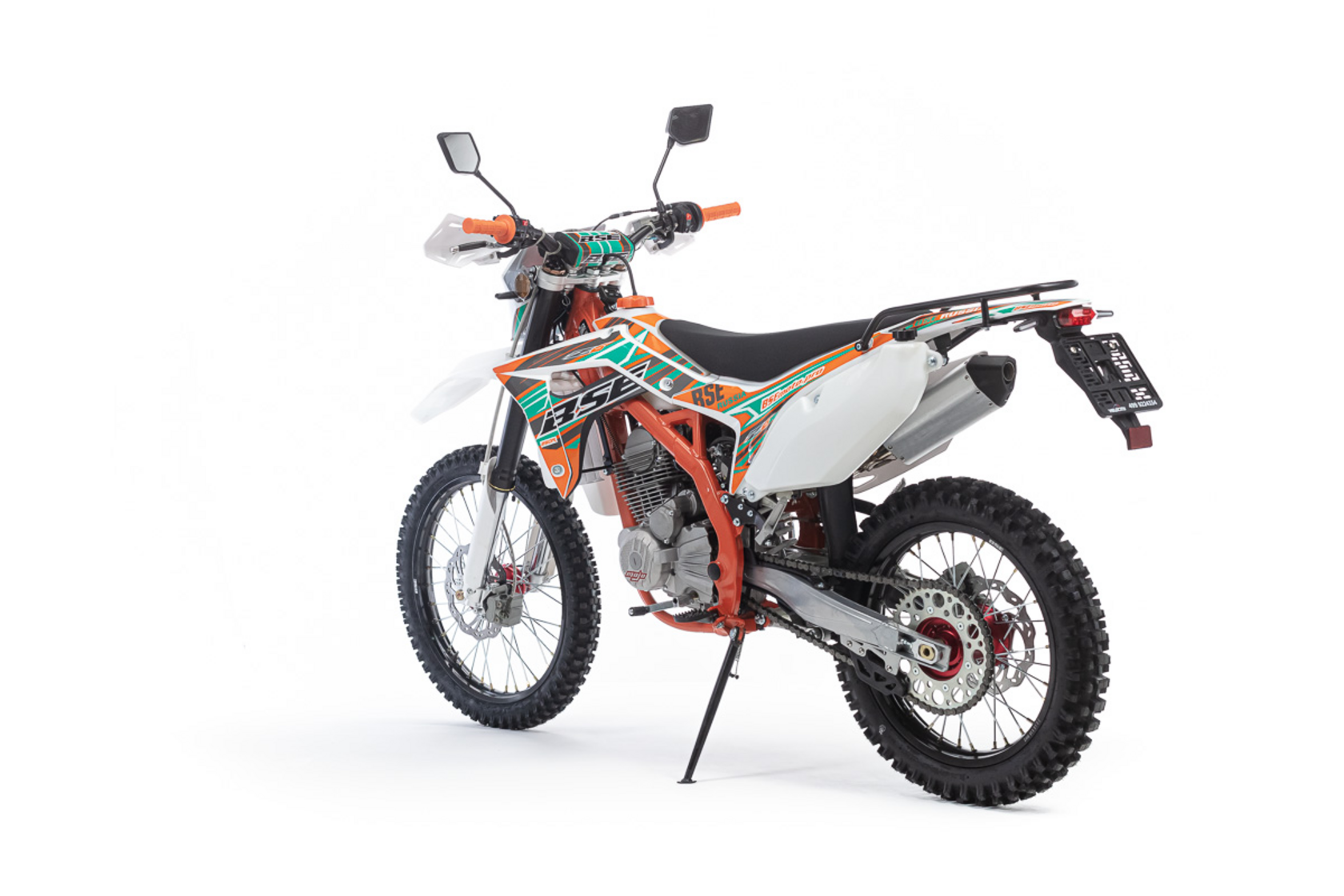 Комплектация Подножки пассажира , 2 бака , багажник,Алюминиевый руль переменного сечения 28мм. Кородкоходная ручка газа. Гидравлические тормоза. Спереди двухпоршневые ,сзади однопоршневые.Диаметр переднего тормозного диска 260 мм, заднего 240 мм.Передняя/задняя звезды 13/45T. Зеркала заднего вида.