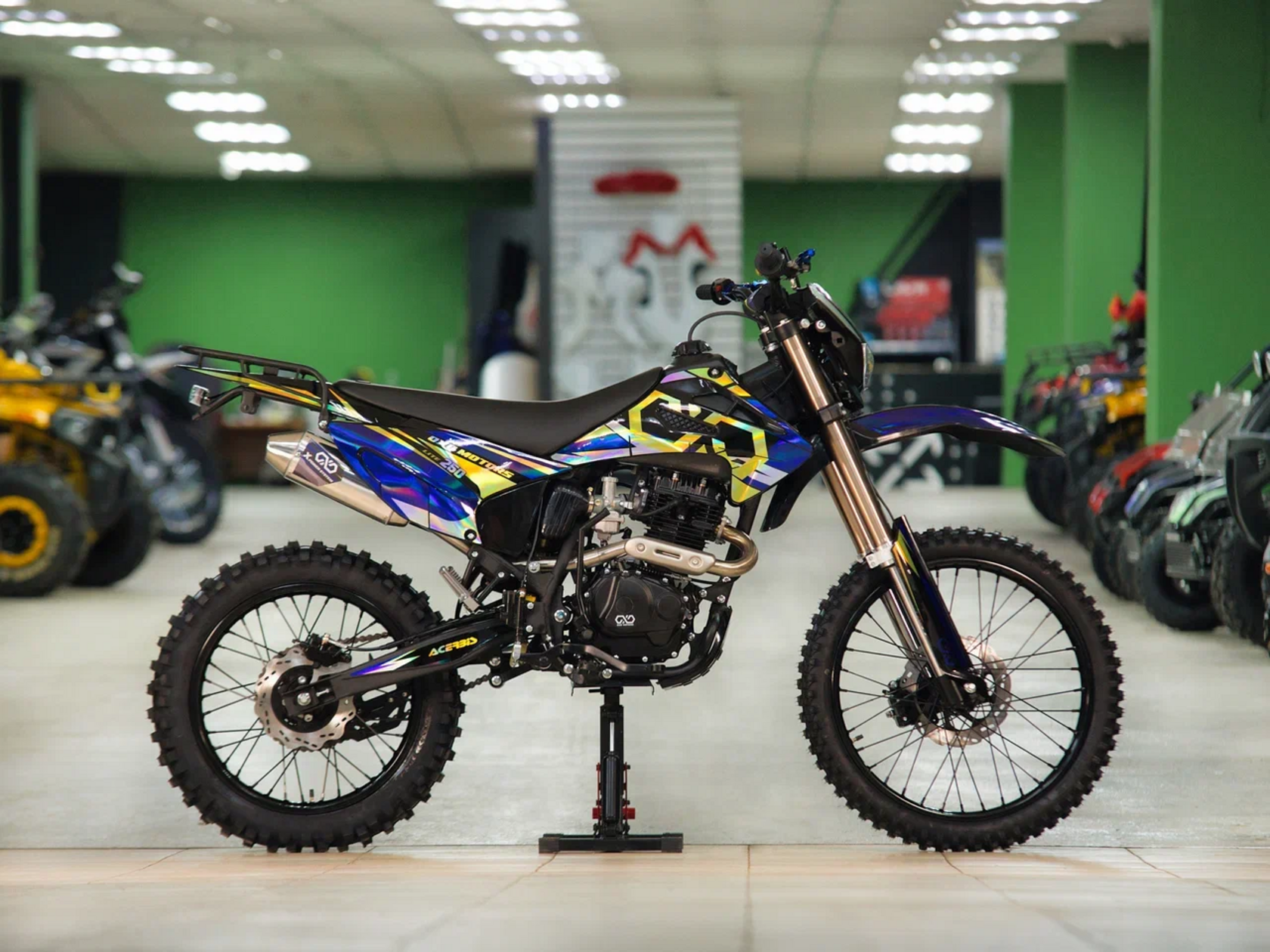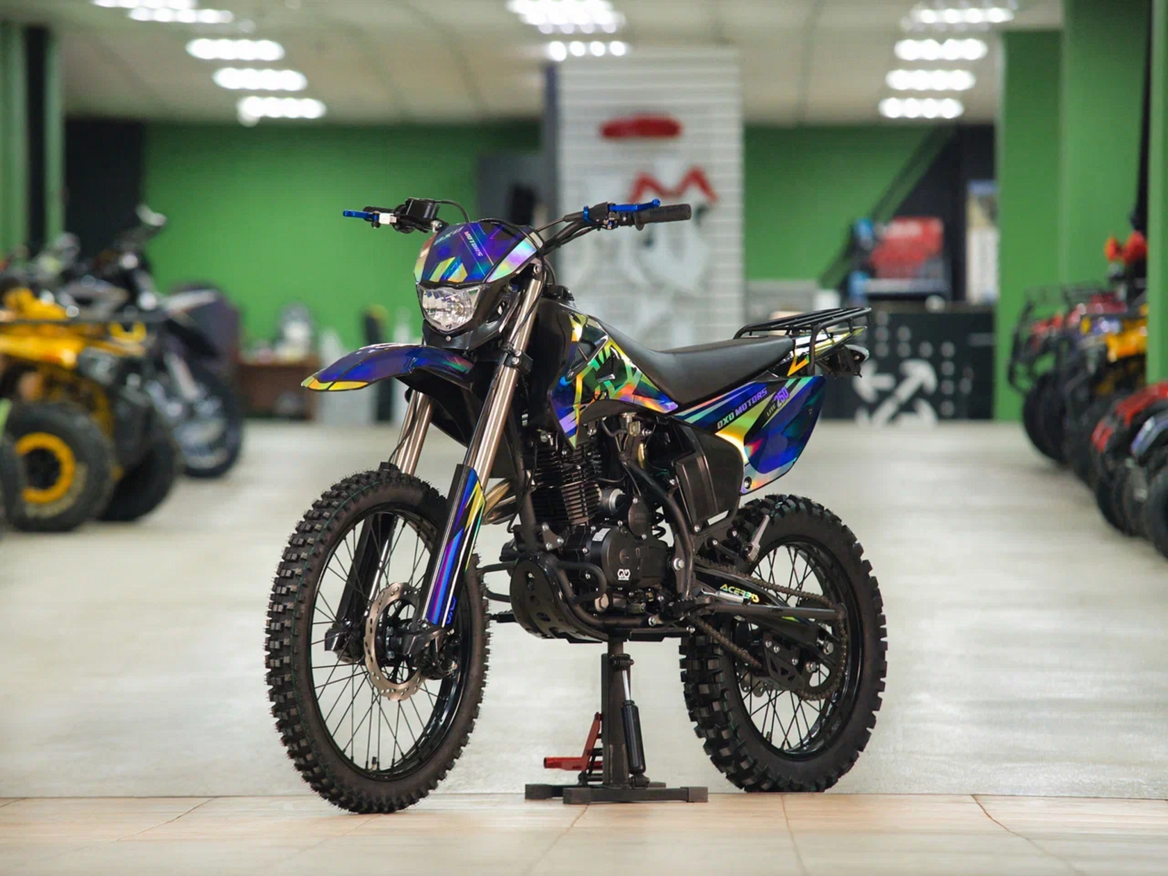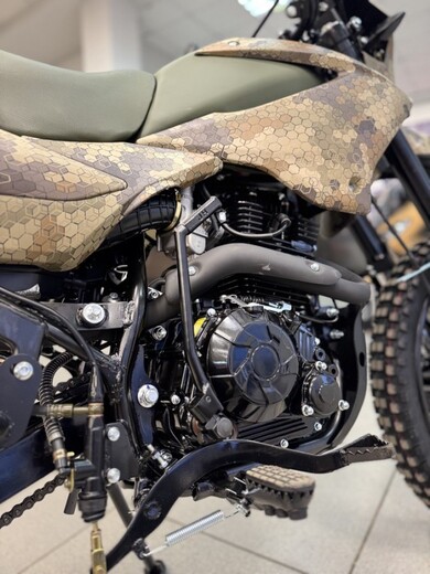 ДвигательДвигатель ZS165FMM - 4-тактный двигатель воздушного охлаждения объёмом 223 куб см с двумя клапанами, оснащён балансировочным валом, благодаря которому уменьшается избыточная вибрация, передаваемая от двигателя на раму и общую конструкцию техники. Характеризуется хорошей тягой с самых низов и лёгким пуском с помощью электростартера. Двигатель отлично зарекомендовал себя в качестве надёжного, универсального, неприхотливого мотора с хорошими характеристиками.РамаРама мотоцикла OXO производится из труб шестигранного сечения хром-молибденовой стали, которая является очень прочной и легкой. Геометрия рамы, благодаря правильно выверенному центру тяжести и углу наклона вилки - способствует наилучшей управляемости устойчивости мотоцикла на низкой скорости.ПодвескаПередняя вилка перевернутого типа. Мотоцикл снабжен моноамортизатором, который соединен посредством системы рычагов прогрессии. Система прогрессии, обеспечивает равномерную, мягкую работу и увеличивает длину рабочего хода подвески.КолесаРазмер передней покрышки: 80/100-21. Размер задней покрышки: 120/100-18. Они прекрасно себя ведут по песку и грязи, что позволяет райдеру отлично показать себя на пересеченной местности.Тормозная системаТормозная система мотоцикла - полностью гидравлическая с армированными шлангами. Спереди и сзади установлен двухпоршневой суппорт. Данная конфигурация тормозных механизмов, позволит быстро и безопасно остановиться с максимальной скорости даже на бездорожье.РульВажная часть современного эндуро мотоцикла - усиленный руль переменного сечения. На руле установлен рычаг заслонки подсоса. Алюминиевая ручка газа с коротким ходом имеет регулировку троса. Также мотоцикл укомплектован электронной панелью приборов.