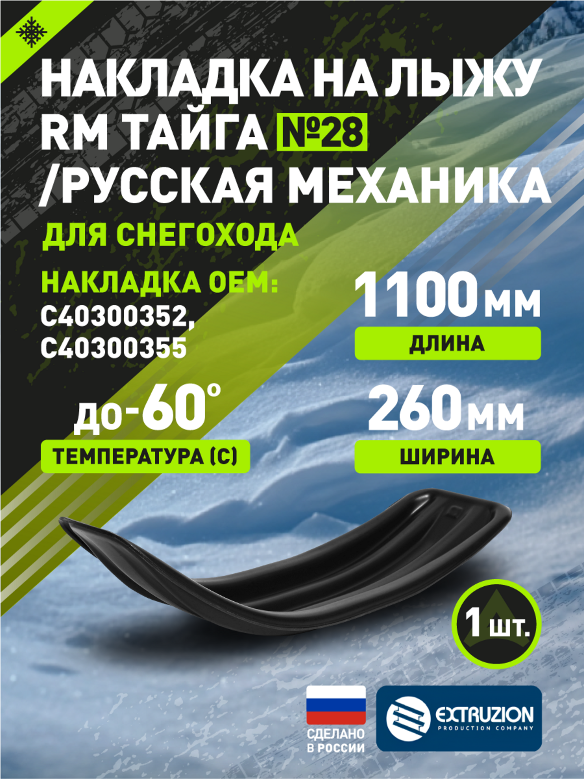 • Специализированная накладка на лыжи для снегоходов «Тайга» и «Русская механика». Разработана для повышения проходимости и защиты стандартных лыж от износа и повреждений. Обеспечивает улучшение ходовых качеств и повышенную плавучесть в глубоком снегу.