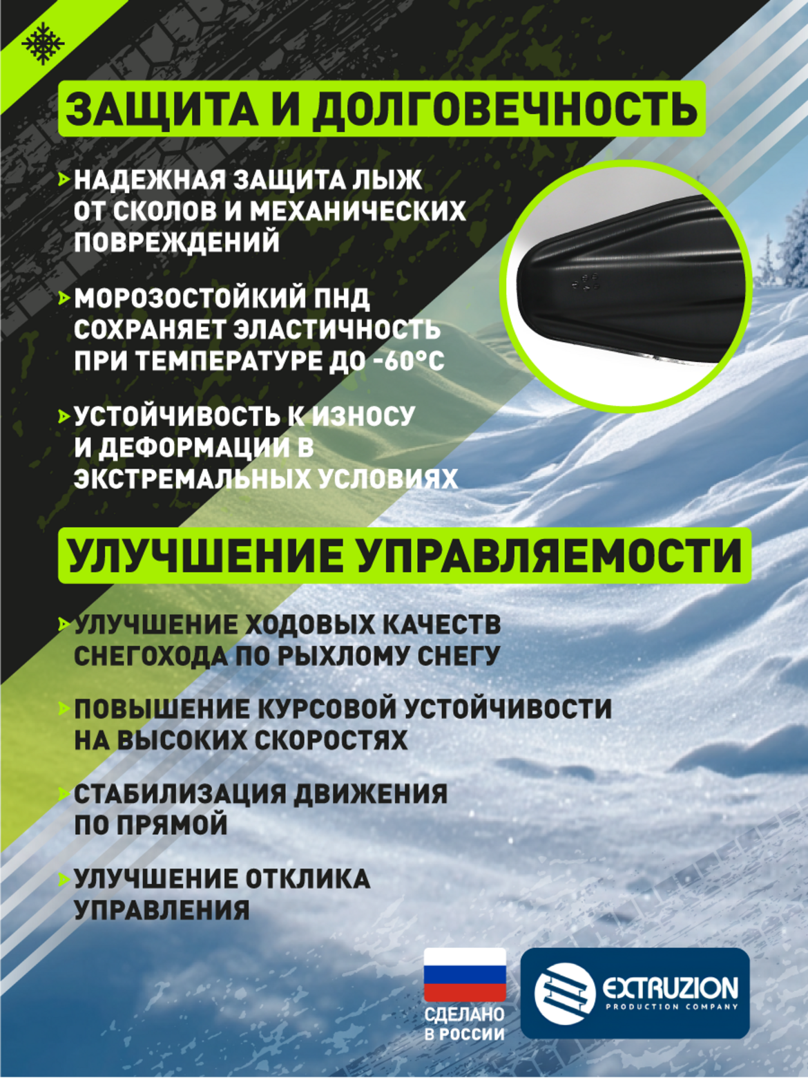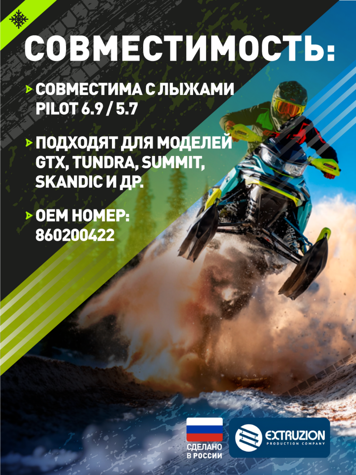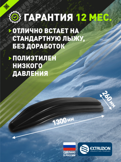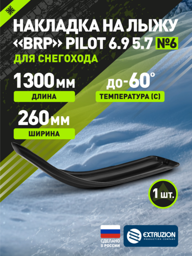 Технические характеристики:• Производитель: Россия, ООО "ЭКСТРУЗИОН"• Материал: морозостойкий ПНД• Размеры: 1300×260×6 мм• Цвет: черный• Комплектация: без крепежа• Гарантия: 12 месяцев• Рабочий диапазон: -60C до +60C• Совместимость: BRP Pilot 6.9 / 5.7Преимущества:Идеальное соответствие – точная посадка на лыжи Pilot• Улучшенная управляемость – повышенная курсовая устойчивость• Защита от износа – продление срока службы лыж• Повышение проходимости – лучшая плавучесть в глубоком снегу• Сохранение гибкости – эластичность при экстремальных температурахОбласть применения:• Снегоходы BRP серии Ski-Doo• Модели с лыжами Pilot 6.9 и 5.7• Спортивная и туристическая эксплуатация• Экстремальные зимние условия• Профессиональное использованиеНакладка «BRP» – оптимальное решение для владельцев снегоходов Ski-Doo. Сохранение оригинальных характеристик с дополнительной защитой и улучшением ходовых качеств.