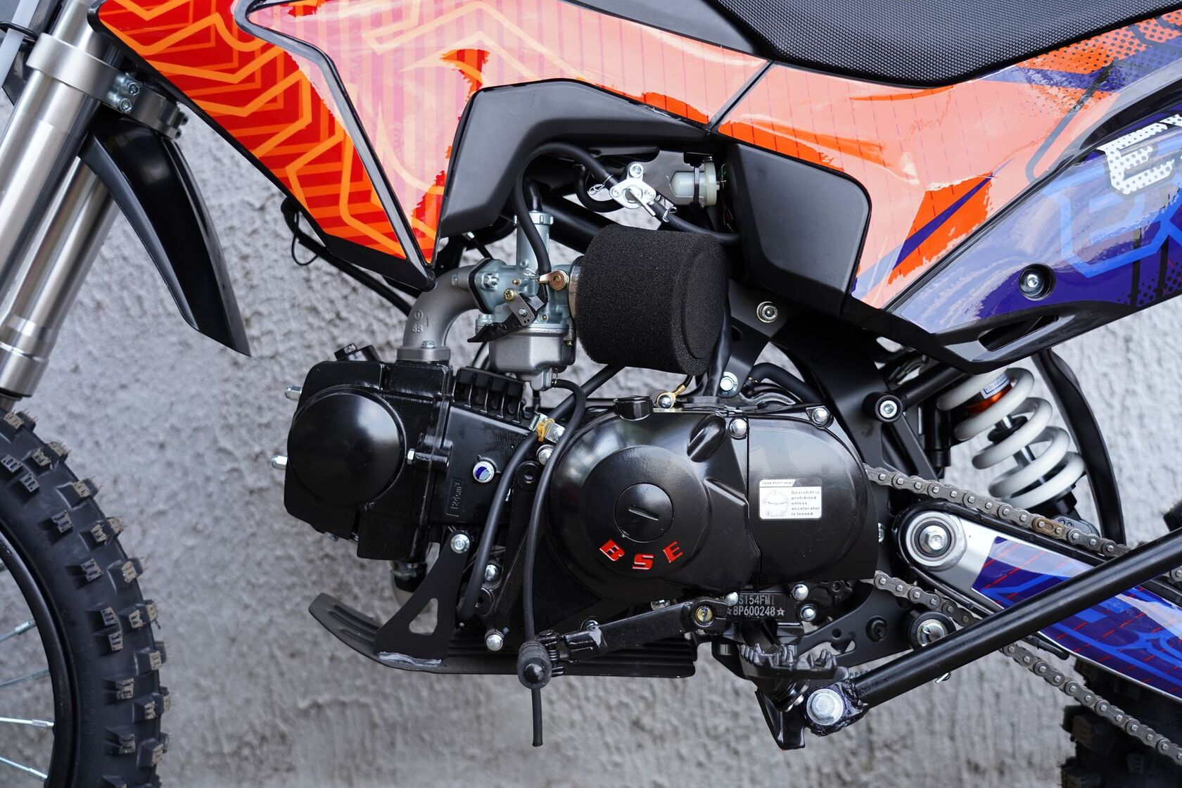 Индустрия мотоциклов постоянно развивается, предлагая новые модели с улучшенными техническими характеристиками. Питбайк BSE EX125 14/12 стоит на передовой этого развития, сочетая в себе мощь и надежность для тех, кто ценит комфорт и высокое качество передвижения.Одной из главных особенностей этого питбайка является его двигатель. С момента своего появления, модель Zongshen ZS154FMI-2 завоевала признание многих экспертов и любителей мототехники. С объемом 125 см3, одним цилиндром и 4 тактами, этот двигатель обеспечивает максимальную мощность до 10 л.с. при 7500 оборотах в минуту. В сочетании с карбюратором MIKUNI VM22 и системой зажигания CDI, двигатель питбайка работает более эффективно, обеспечивая плавный запуск и отзывчивость на газ.Каркас питбайка выполнен из прочной стали, что обеспечивает надежную защиту и долгий срок службы. Передняя подвеска перевернутого типа с телескопической конструкцией и задняя подвеска с моноамортизатором позволяют сгладить неровности дороги и обеспечивают уверенное управление на любом типе местности.Сцепление многодисковое, находящееся в масляной ванне, обеспечивает плавное переключение передач, что особенно важно при активной езде и маневрах. Трансмиссия N-1-2-3-4 позволяет выбирать оптимальную передачу для различных условий дороги и скорости движения.Тормозная система питбайка BSE EX125 оснащена гидравлическими дисками диаметром 220 мм спереди и 190 мм сзади, обеспечивая надежное и эффективное торможение даже на высоких скоростях. Высокий клиренс в 290 мм и габариты 1700х760х1090 мм делают этот питбайк универсальным средством передвижения как по городским улицам, так и по бездорожью.
