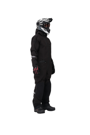 Комбинезон предназначен для снегохода и сноубайка. Надежно защитит от ледяного ветра и мокрого снега. Ткань верха дополнительно содержит тефлоновое водоотталкивающее покрытие. Внешние молнии влагозащитные. Проклеены все швы. На рукавах есть эластичные манжеты, на штанинах снегозащитные юбки с петлёй для фиксации к ботинкам. При закрытой вентиляции и карманах комбинезон герметичен.Функционал комбинезона тщательно продуман и зарекомендовал себя среди снегоходчиков и сноубайкеров. Светоотражающие элементы есть со всех сторон. Семь карманов покрывают все потребности райдера, в том числе для ски-паса, телефона, и теплые, для согревания рук. Есть удобная петля под тангенту рации и кольцо D-ring для ключа горного снегохода. Центральная молнии с тремя замками: открывается сверху и снизу. Несъемный капюшон с двойной утяжкой. Для удобства приема пищи и воды во время стоянки – есть расширения на воротнике, защищает от ветра в расстёгнутом виде. В помещении можно снять верхнюю часть комбинезона и воспользоваться регулируемыми лямками - подтяжками.